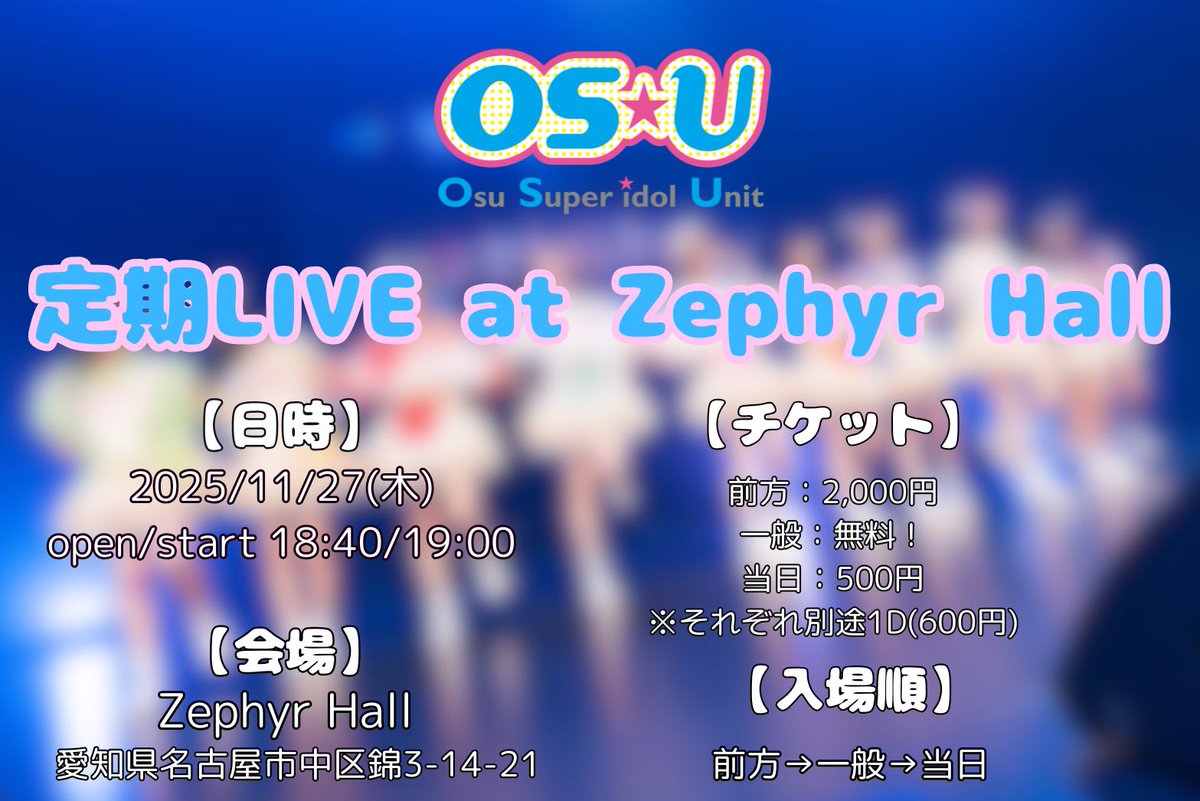 「OS☆U 定期LIVE at Zephyr Hall」 日時 2025.11.27(木) 会場 Zephye […]