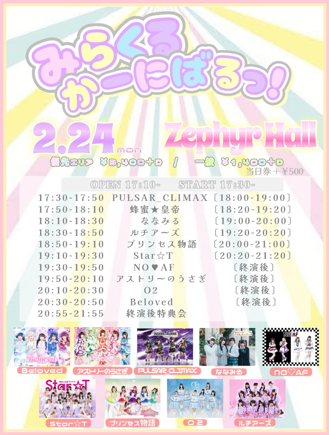 5:00 PM - 10:00 PM みらくるかーにばるっ! 2月 24 @ 5:00 PM - 10:00 PM みらくるかーにばるっ! 日時 : 2025.2.24(月祝) 会場 : zephyr Hall 金額 : 優先エリア 3400円 / […]