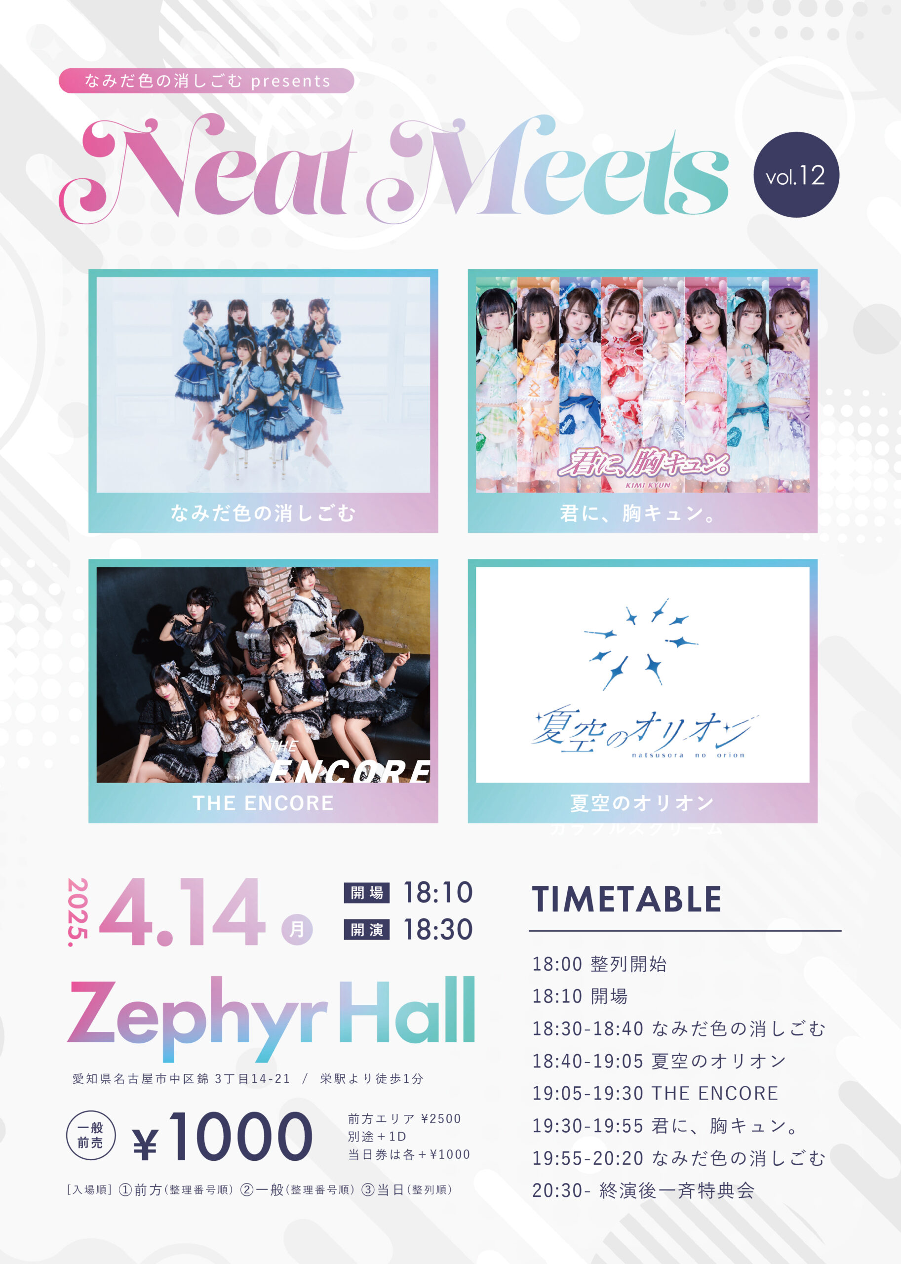 6:00 PM - 9:30 PM なみだ色の消しごむ presents『Neat Meets vol.12』 4月 14 @ 6:00 PM - 9:30 PM なみだ色の消しごむ presents『Neat Meets vol.12』 なみだ色の消しごむ presents『Neat Meets vol.12』 ■日程 2025年4月14日(月) […]