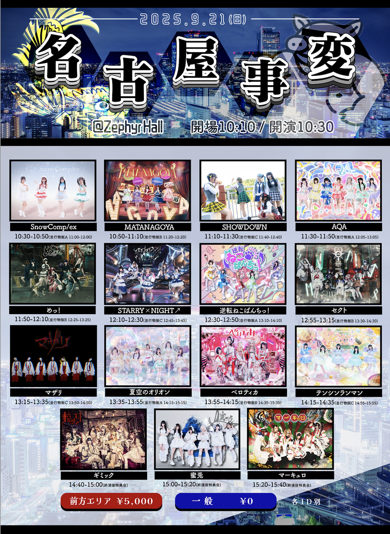 10:00 AM - 7:00 PM 名古屋事変 9月 21 @ 10:00 AM - 7:00 PM 名古屋事変 公演日時 2025/9/21(日) 開場時刻 10:10 / 開演時刻 10:30 会場 Zephyr Hal […]