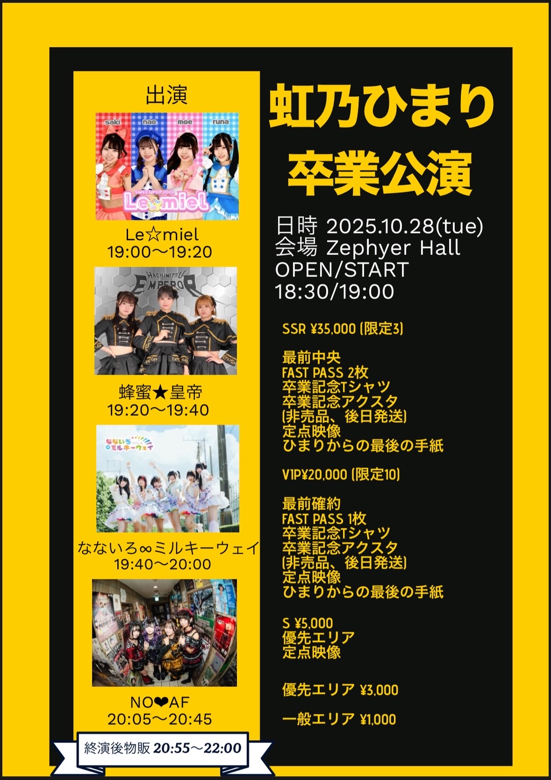 6:30 PM - 9:30 PM 虹乃ひまり卒業公演 10月 28 @ 6:30 PM - 9:30 PM 虹乃ひまり卒業公演 虹乃ひまり卒業公演 日時 2025.10.28(火) 会場 Zephyer Hall OPEN/START 1 […]